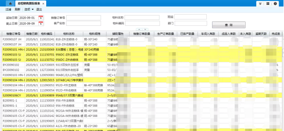 通過二開報表的方式,增加了銷售訂單跟蹤表,通過該表可直觀看到銷售訂單的生產(chǎn)排產(chǎn)、入庫等情況,包括逾期未入庫時間等,并通過不同的顏色顯示,可直觀看到每個訂單的狀態(tài),更利于管理人員對訂單的跟蹤及管理。